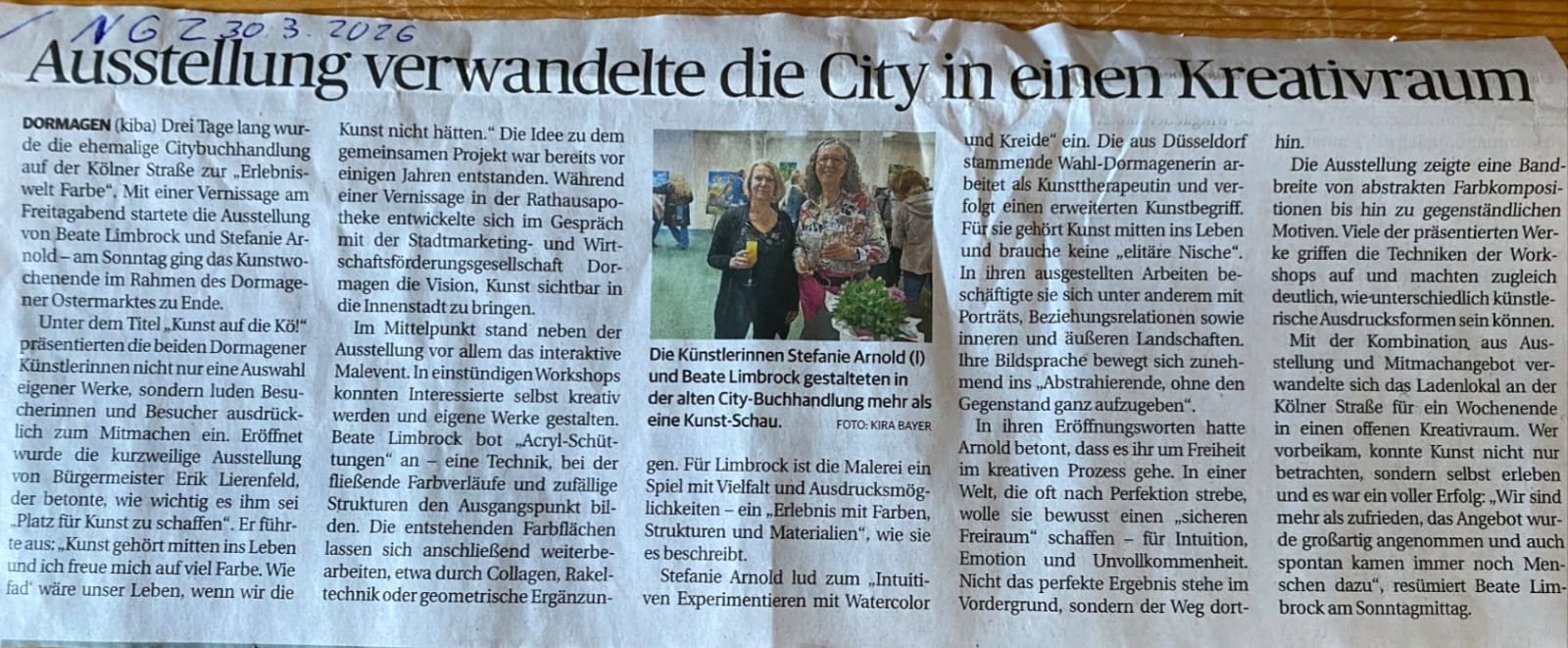 Farben, Begegnungen und Freude am Gestalten – unter dem Titel „Erlebniswelt Farbe – Kunst auf die Kö!“ haben Beate Limbrock und ich an einem Wochenende die Dormagener Innenstadt in einen Ort voller Kreativität verwandelt. Drei Tage lang hat sich die ehemalige City‑Buchhandlung an der Kölner Straße in ein lebendiges Atelier verwandelt, in dem Kunst nicht nur betrachtet, sondern erlebt werden konnte.